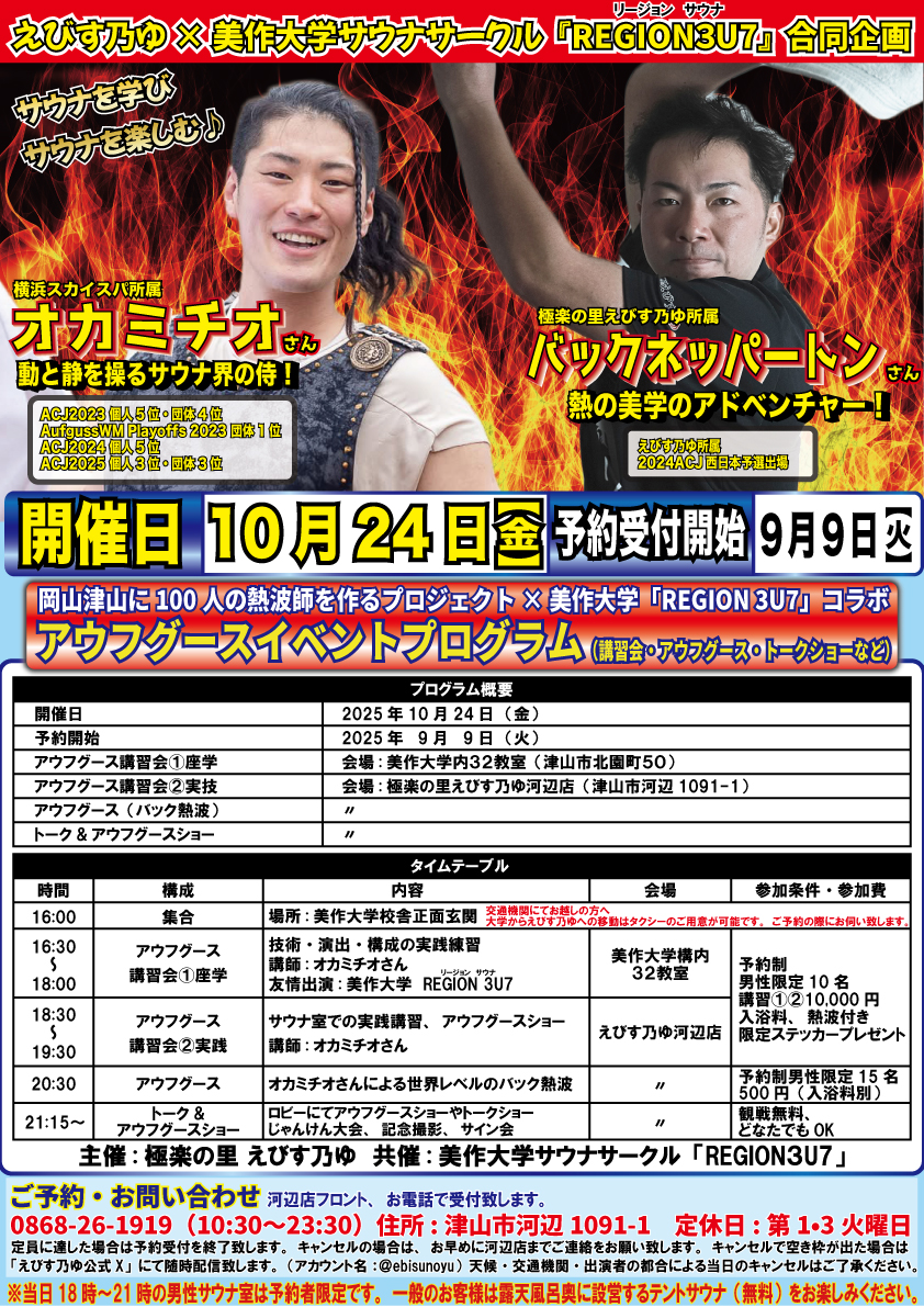 美作大学サウナサークル「REGION3U7(リージョンサウナ)」は、津山市の温浴施設「極楽の里 えびす乃ゆ 河辺店」と合同で、岡山津山100人熱波師プロジェクト!と題したサウナを通じた地域活性化イベントを開催します。