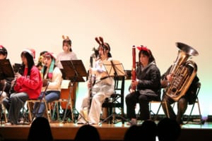 ライブの最後には、この日のために学生が準備した書き下ろしの楽譜を用い、吹奏楽部全員と、FMみまさかと軽音楽部5名の合同で「Soranji」「Dragon Night」の2曲を演奏。団体や学科の枠を越え、音楽を通してつながる合同ライブならではのステージとなりました。