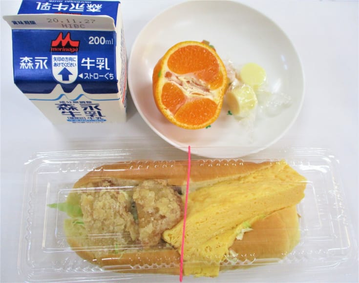 調理パン(鶏竜田揚げ・玉子焼)・チーズ・みかん・牛乳