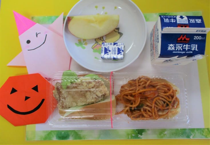 ・調理パン(鶏竜田揚げ・スパゲティ)・チーズ・りんご・牛乳
