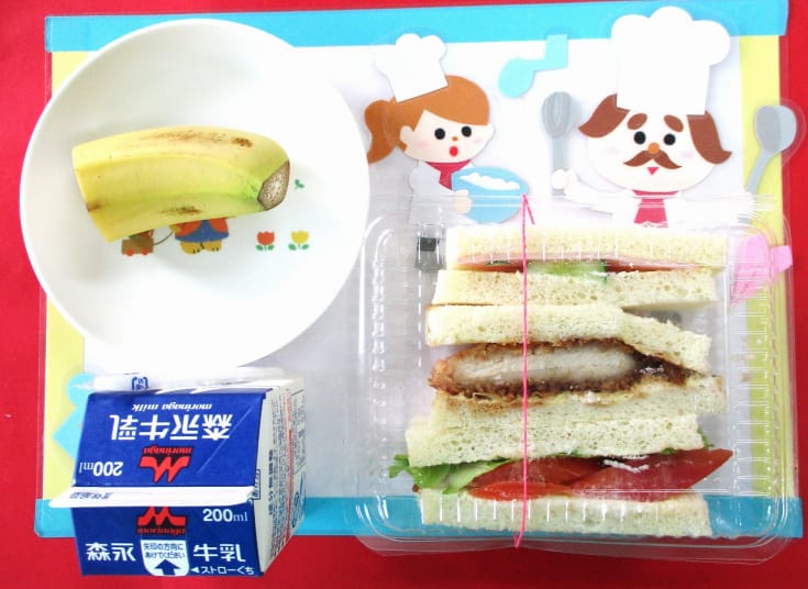 ・サンドイッチ(トンカツ・トマトレタス・ハムきゅうり)・バナナ・牛乳
