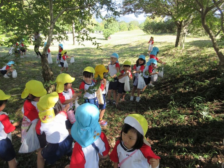 10月10日(金曜日)年少組と年中組がグリーンヒルズに園バスで出かけ、園内を散策しました。大小いろいろな大きさのどんぐりや木の実、色づいた落ち葉などを拾ってとても嬉しそうでした。暑かったのですが、風は爽やかで気持ちよく秋の自然を満喫した一日でした。