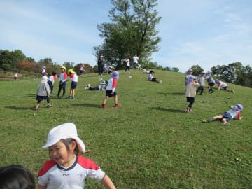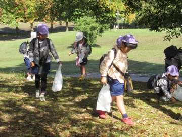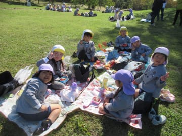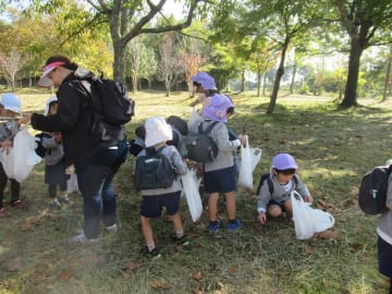 11月4日(火曜日)年長組が園バスに乗ってグリーンヒルズに弁当持参で出かけました。たくさんのどんぐりや落ち葉があり、晴天の中子ども達は大喜び。袋いっぱいに木の実や葉っぱを拾って帰りました。弁当は芝生一面の絶景の中でいただき大満足でした。楽しい時間はあっという間で帰りのバスの中では「また行きたいな~」という感想もあり秋の素敵な思い出のひとつができたようです。