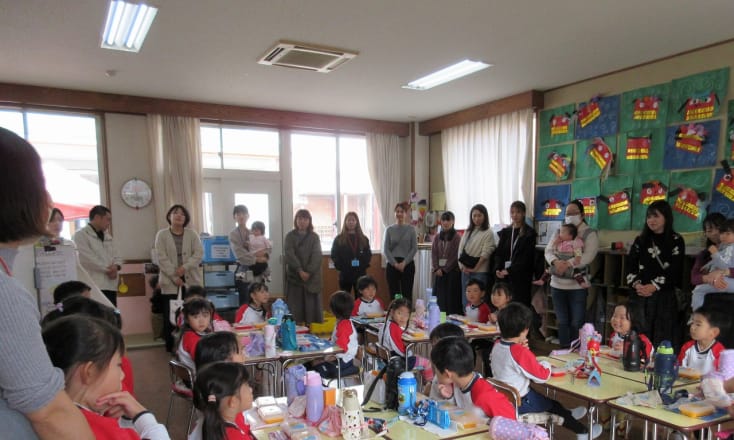 11月26日(水曜日)年中組の給食試食会を行いました。2クラス合同で31名の参加があり、お母さん方の給食に対する関心の高さを感じることができました。まず、各クラスの子ども達が給食を食べる姿を見ていただき、その後、別室にて子ども達と同じ給食を試食してもらいました。本園の管理栄養士より献立の説明があり、当日のコロッケは子ども達が収穫したさつまいもであることに歓声があがっていました。また、素材の味を大切にした味付けや噛み応えのある調理法、小学校の給食に向けて酢を使用している工夫などの話を興味深く聞いておられました。その後はみなさんで茶話会にて親睦を深められたようでした。