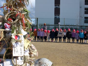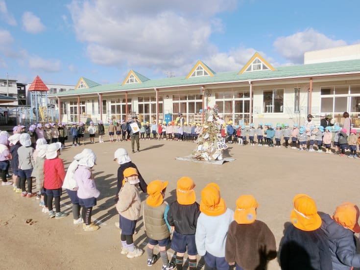 2026年1月7日(水曜日)三学期が始まり、14日(水曜日)に全園児でとんどを行いました。各家庭より持ち寄った正月飾りや書初めが舞い上がり、みんなで今年一年の無病息災を祈りました。