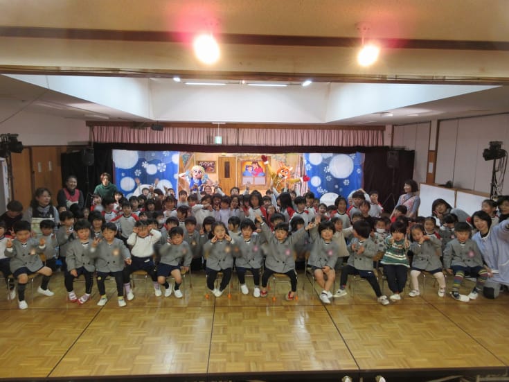 2月16日(月曜日)全園児で劇団バンブーによる着ぐるみ人形劇「手ぶくろを買いに」を観劇しました。遊戯室が素敵な空間に変化して、心温まるお話でみんな集中して楽しむことができました。また、劇団の方の手遊びや歌遊びも笑顔いっぱいの子ども達でした。