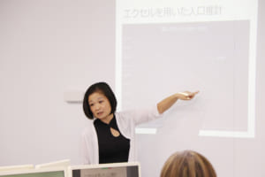 2回目となる今回も本学で「調査と統計」「情報リテラシー」などの科目を担当する稲益智子准教授が講師を務め、前回入手した人口データからexcelで将来人口を推計する方法や、人口と社会指標の関連分析を解説しました。