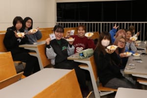 このイベントは寮生たちが運営する自治会主催で実施されました。参加した学生たちに藤原理事長よりケーキが振舞われ、皆で美味しくいただきました。