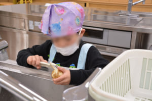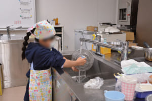 また、料理の合間には子どもたち自身が使った調理器具やボウルを洗う姿も見られました。次の工程をスムーズに進めるために自分たちで考えて行動する様子が印象的で、調理の段取りを体感する貴重な経験となりました。