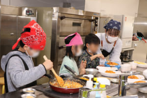 調理用ハサミを使って具材を切るところからスタート。安全に配慮しながら、一つひとつの工程に丁寧に取り組みました。たくさんのケチャップライスをフライパンで炒める作業は、子どもたちにとって少し重たく大変な様子も見られましたが、学生スタッフのサポートのもと、最後までやり遂げる姿が印象的でした。