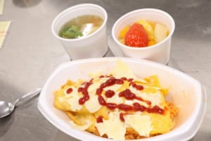 型でくり抜いたスライスチーズとケチャップでデコレーションして、自分だけのオムライスが完成しました。フルーツポンチと、スタッフが用意した水餃子スープと一緒にいただきました。