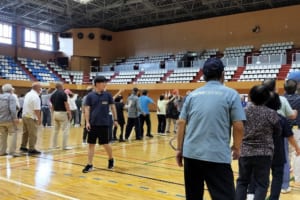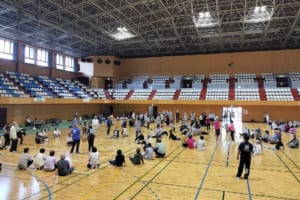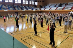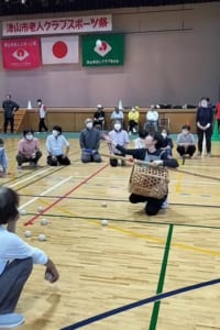 津山市老人クラブスポーツ祭は、津山総合体育館で毎年開催されており、津山市の老人クラブ会員約300人が参加する大きなイベントです。今年度は、ボール送りリレー、車いす体験リレー、グラウンドゴルフ、玉入れなどの種目で交流を深めました。
