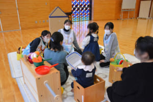 会場には木の玩具やおままごとコーナー、手作りのそりなどが並び、子どもたちはそりに乗って遊んだり、思い思いに遊びを楽しむ子どもたちの姿が見られました。