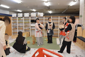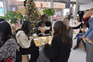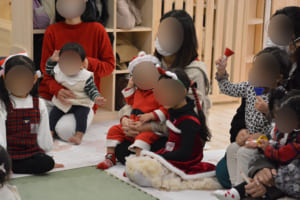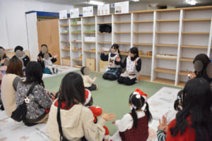 今回は、12月21日(日曜)ソシオ一番街にオープンしたばかりの子育て支援施設「木育ひろば もくもくのもり」を会場に実施しました。広場の入り口には大きなクリスマスツリーが飾られ、サンタクロースの衣装を身にまとった子どもたちの姿も見られるなど、会場はクリスマスムードに包まれていました。木のぬくもりあふれる空間の中、親子で安心して過ごせるひとときとなりました。