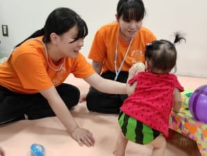学生スタッフは、保護者の方と会話しながら子どもと遊び、子育ての情報や子どもの発達について教わっていました。また、2か月の赤ちゃんも来てくれたので、順番に抱き方を教わったり、あやし方を工夫したりして、乳児との触れ合うこともできました。