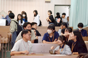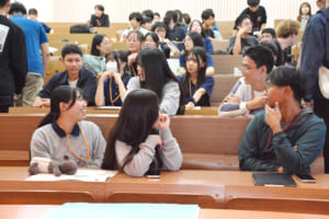 テーブルを囲み、普段と違う雰囲気の中、学生たちはお互いの国の話題や日常の話題で盛り上がりました。