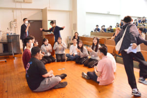 授業では、まず幼児教育学科の学生が、保育現場を想定して「みなさん、これから幼稚園・保育園児になってください」という呼びかけからスタート。