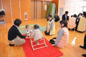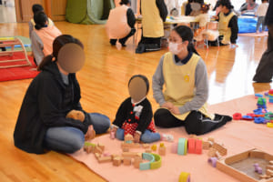指先を使う微細運動、体を動かす粗大運動、感覚遊びなど、0~2歳児の発達に合わせた手作りおもちゃが並び、子どもたちは興味の向く遊びを自由に楽しみました。