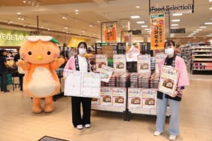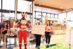さらに、ウエストランド店には本学マスコットキャラクター「ミマッパ」、ノースランド店には「ミマダイン」、志戸部店には「ミマサカイザー」も応援に駆けつけ、学生と一緒に販売を盛り上げました。店頭は笑顔と活気に包まれ、多くのお客様にご購入いただきました。