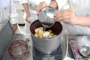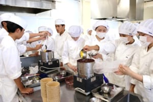 続く調理実習では、生徒たちが5名ずつのグループに分かれ、材料の計量からブレンド、トッピングまでを体験しました。