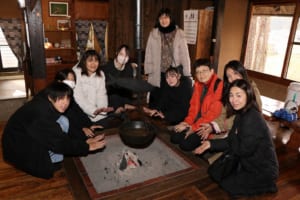茅葺屋根の外装や囲炉裏、あまりスーパーなどでは見かけない食材らに、学生たちは目を輝かせていました。
