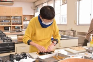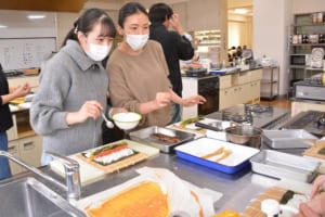調理室では、学生たちが藤井わか子教授の指導を受けながら、声を掛け合い、楽しそうに恵方巻を巻く姿が見られました。