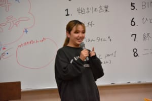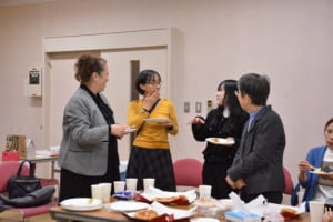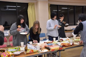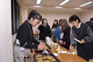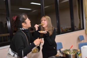 お寿司やピザなどが並ぶ中、ひときわ注目を集めたのが、井上美咲子先生による手作りの「ニラうどん焼き」です。ホットプレートで一つひとつ丁寧に焼き上げられた一品は、「とてもおいしい!」と学生たちの間で大人気となり、教室には自然と笑顔が広がっていました。
