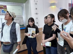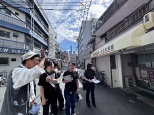 山田氏より、釜ヶ崎が戦後の労働者街として形成され、現在も多くの生活困窮者や路上生活者が暮らしている現状について解説を受けました。かつての労働需要の変化や社会的背景により、地域が抱える課題が深刻化してきた経緯を学びました。