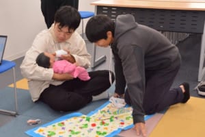 参加者は、赤ちゃんをあやしたり、抱っこやミルク、おむつ替えを体験し、乳児との接し方について学びました。