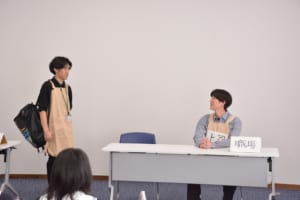 その後、大学生が講義内容をもとに軽演劇を披露しました。日常のちょっとした言葉づかいや態度の違いをユーモアを交えて表現し、高校生たちは笑い交じりに真剣に見入っていました。