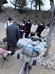さらに、路上訪問として姫路城の東屋を訪れ、路上生活を送る男性から、路上生活に至った経緯や日々の食事・収入状況、襲撃の有無などについてお話を伺いました。学生にとって、教室での学びを現実の課題と結びつけて考える大変貴重な学習の機会となりました。