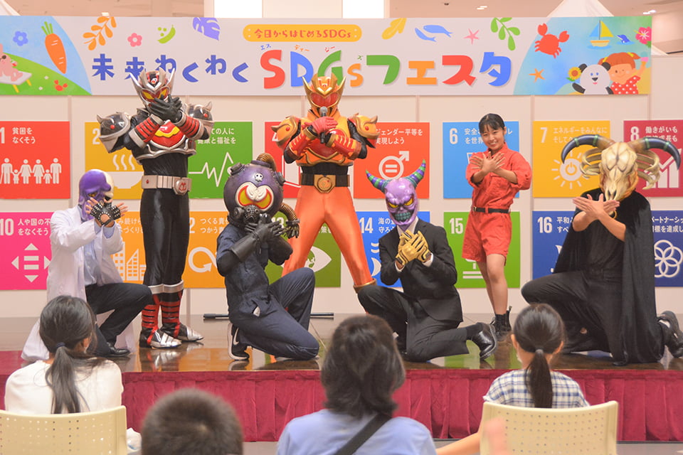 2021年に本学のTVCMから誕生したマスコットキャラクター「地域貢剣ミマダイン」を活用したヒーローショーを行っています。「ショーを通じて地域の子どもたちを喜ばせたい!」という想いのもと、児童学科を中心にさまざまな学科・学年の学生十数名が在籍しています。活動は岡山県北を中心に、幼稚園や保育所、企業や商業施設のイベントなどでショーを披露。脚本はオリジナルで、「食べ残しをしない」「商品は賞味期限の近い手前から取ろう」などSDGsの啓発の視点も取り入れています。お近くでショーがあればぜひ観にきてください! 仲間も募集中です!
