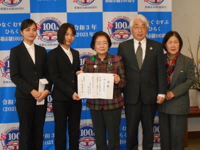 2月21日(金曜)、鵜﨑学長、新垣美月さん(首里城再建募金活動の代表/食物学科3年/那覇高出身)、福地ゆめのさん(食物学科3年/糸満高出身)、沖縄県担当参与の比嘉先生の4名が、城間幹子那覇市長へ、寄付金100万円の目録を手渡しに行きました。