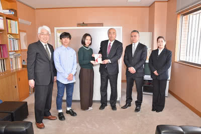 3月17日(火曜)、株式会社グリーンベルトなど4社でつくるGBグループ内の社会貢献を目的とする異業種任意団体「一心会」より、10万の首里城再建支援金をいただきました。この日、新垣美月さん(首里城再建募金活動の代表/食物学科3年/那覇高出身)と呉屋 廉太さん(次期沖縄県人会長/児童学科2年/宜野湾高出身)が受け取りました。