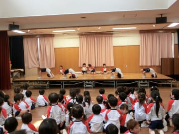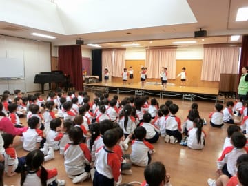4月23日(火曜日)年長組が新入児に向けて歓迎会を行いました。何でもできる年長児たちは、ダンスやなわとび・鍵盤ハーモニカ・はらぺこあおむしのペープサートなど、たくさんの出し物をしてくれました。新入園の子ども達も生活にも少しずつ慣れ、落ち着いて見る事ができ一緒に楽しむことができました。今日をきっかけに色々なことに興味を持つことができ、益々園生活が楽しみになりました。