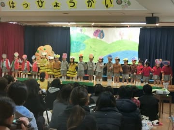 12月19日(水曜日)年少組の発表会を行いました。初めての発表会にドキドキ・ワクワクの子ども達でしたが、3クラス合同で歌・お手玉あそび・リズム奏を行った後、各クラスごとに劇あそびを行いました。