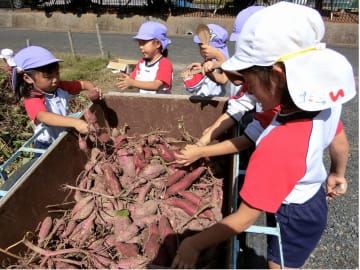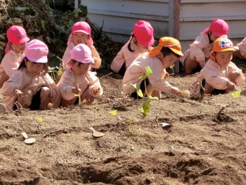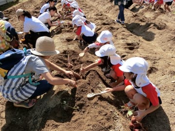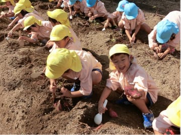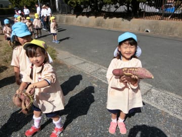 10月9日(水曜日)幼稚園の畑で芋ほりをしました。さつま芋を傷つけないようにしゃもじで慎重に掘りました。今年は大きな芋がたくさんできており、「先生見て!こんなに大きいおいも」「まだまだ出てくるよー」と笑顔いっぱいになりました。掘るのは大変でしたが、大きな芋を抱えて大満足の子ども達。早速、おみやげに持ち帰りました。ご家庭でどんな料理に変身したのでしょうか。幼稚園でもみんなで焼き芋パーティーをしていただく予定です。年長児が焼き芋屋さんになり、秋の味覚を楽しみたいと思います。