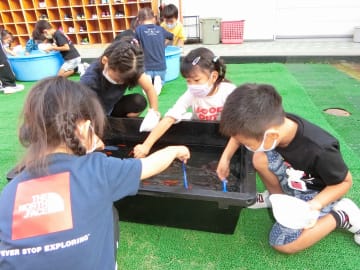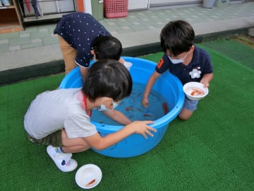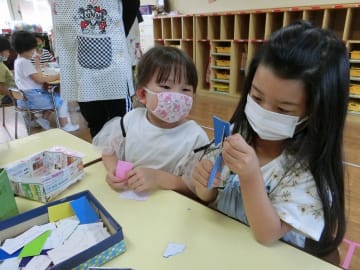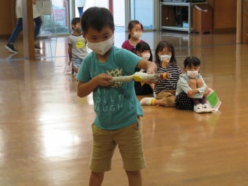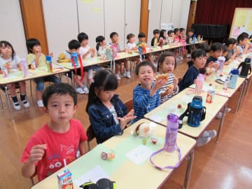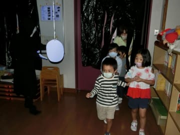 10月2日(金曜日)年長組お楽しみ会を行いました。当日は午前保育で一度帰宅し15:30に再度登園し、スタートしました。射的・切り紙・金魚すくい・プラバン作りのゲームラリーを楽しんだ後、みんなで夕食のハンバーガーを食べました。お楽しみ会の最後はきもだめしで締めくくりました。新型コロナウイルス感染症の影響で延期になったお楽しみ会でしたが、いつもと違う雰囲気や環境で友達と力を合わせ頑張った年長組です。これからの行事にもみんなのパワーで楽しく取り組んでいきたいと思います。