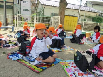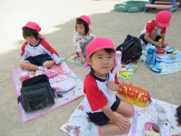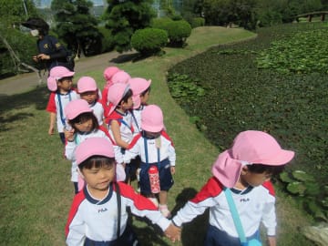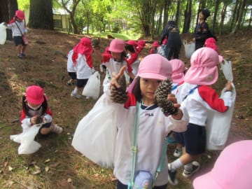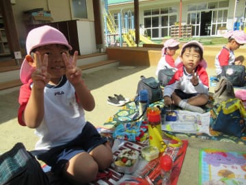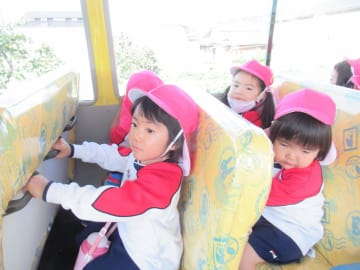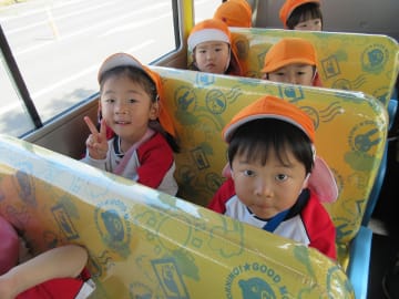 10月6日(金曜日)年少組が聚楽園に出かけました。行きは幼稚園バスに乗り津山駅周辺を周遊し、聚楽園まで行きました。初めての幼稚園バスに乗った人も多くとても喜び嬉しい子ども達でした。聚楽園ではまつぼっくりやどんぐりを拾い、秋を感じることができました。帰りは幼稚園まで歩いて帰り、交通安全にも気を付けながら、みんなでがんばって歩き到着後は園庭で弁当を食べ、特別感を味わうことのできた1日でした。