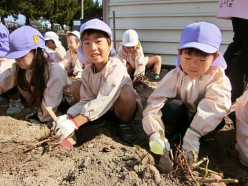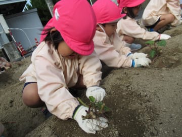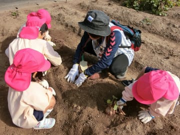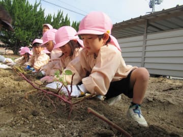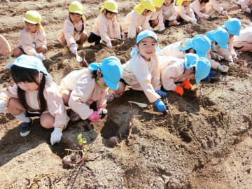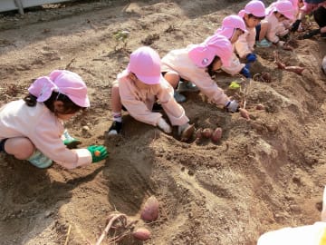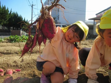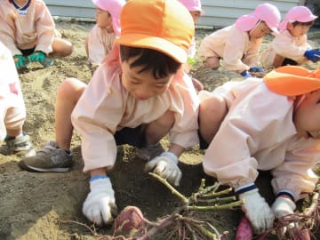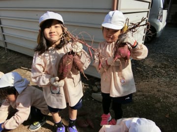 10月25日(水曜日)26日(木曜日)幼稚園のなかよし農園で芋ほりをしました。芋ほりをする前から「芋ほりするぞ!」とやる気満々の子ども達でした。土の中に眠っている芋を見つけては大はしゃぎ。しゃもじや手を使って必死に掘りました。掘り上げた新鮮なさつま芋をキラキラした笑顔で見せてくれた子ども達。収穫量を心配していましたが、猛暑に耐えたさつま芋は今年も豊作で本日家庭に持ち帰りました。色々な料理で秋の味覚を楽しんでほしいです。