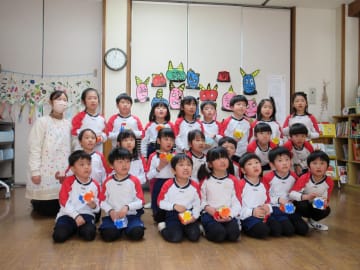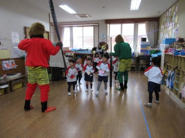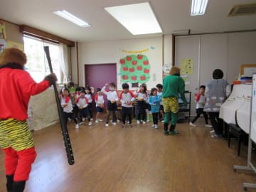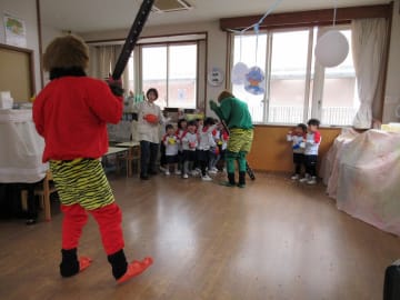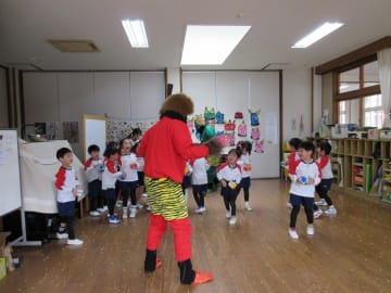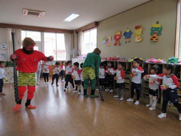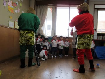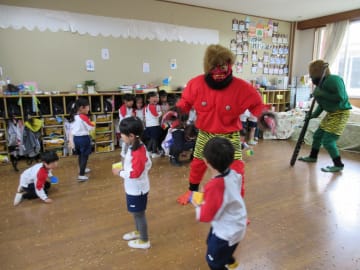 2月2日(金曜日)幼稚園には今年は1日早く節分がやってきました。鬼の面や豆を入れる升を作って、ドキドキしながらこの日を待っていた子ども達でした。鬼が教室に入ってくると、「鬼はーそと!福はーうち!」と一生懸命豆をぶつけ、鬼退治をすることができました。
