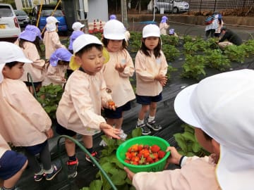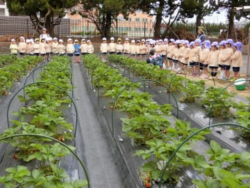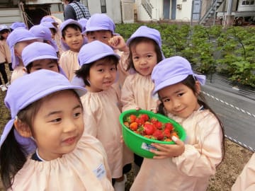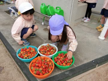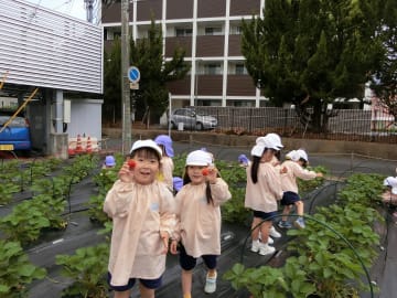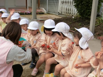 5月8日(水曜日)年長児が今年初めて幼稚園のなかよし農園に出かけ、いちご摘みを体験しました。真っ赤に熟したいちごを大切に摘み取り香りや食感を楽しみながらみんなで一緒にいただきました。露地で熟したいちごは「甘くてとても美味しい!」と大好評でした。次は年中・年少児も出かけたいと思います。