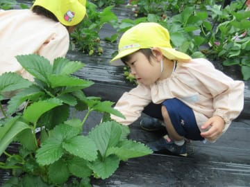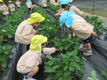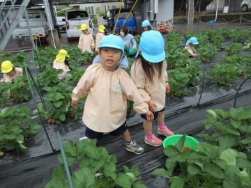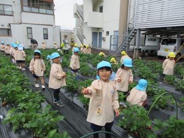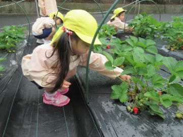 5月13日(月曜日)年中組が待望のいちご摘みに出かけました。もちろん幼稚園のすぐ近くのなかよし農園へ。「僕たちはいつ行くの?」ととても楽しみにしていた子ども達。真っ赤に熟したいちごを見つけ、大切に摘み取る体験に満足の表情の年中組でした。部屋で美味しさをかみしめながら、「次はいついけるかな~」と次回も楽しみにしながらいただきました。