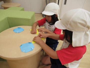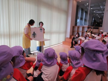 6月11日(火曜日)年長組が大学の図書館内(サークルコモンズ)へ出かけました。本園の保護者クラブの一つである「イソップクラブ」の方々にペープサート使用のクイズ、大型絵本「おじさんのかさ」「ぐるんぱのようちえん」の読み聞かせと、最後に花の折り方を教えていただき、みんなで折り紙も挑戦しました。たくさんの活動で子ども達もワクワクが止まらない様子でした。図書館の利用と共に、図書館でのマナーも学ぶことのできた良い機会となりました。