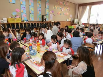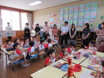 6月17日(月曜日)ひまわり組19日(木曜日)もも組の給食試食会を行いました。給食が始まり2ヵ月。子ども達が給食を食べている様子を見ていただいたり、実際に子ども達と同じ給食も食べていただきました。本園管理栄養士の給食作りのポイントに熱心に耳を傾けて下さる保護者の方々でした。食後のアンケートには、「美味しかったです」「栄養バランスがとても考えてあり安心しました」「家でも参考にしたいです」など嬉しい感想がありました。食後はお茶を飲みながらの楽しい時間が過ごせたようです。ご参加ありがとうございました。