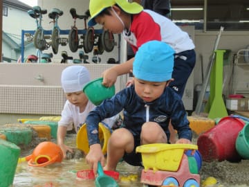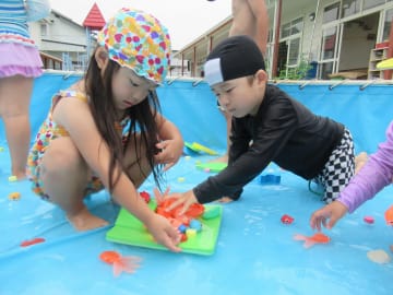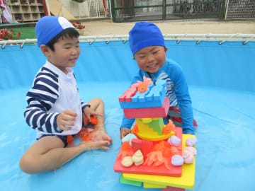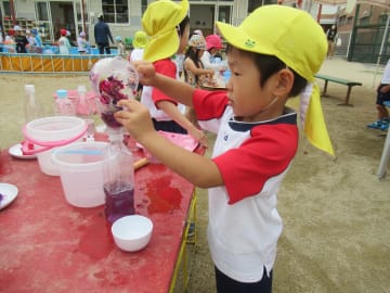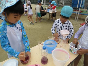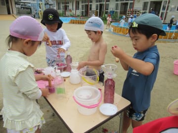水遊びの期間中、年中組でも大型プールを使用しての水遊びやペチュニアでの色水遊び、砂場や園庭での泥んこ遊び、水鉄砲やシャボン玉等、多くの水遊びを楽しみました。水遊びの経験から、色々な素材に触れ感触を味わったり試したり工夫したり、また不思議さを感じたり考えたりと色々な体験ができました。