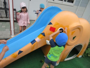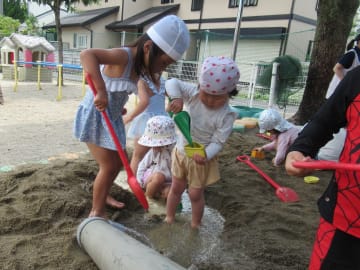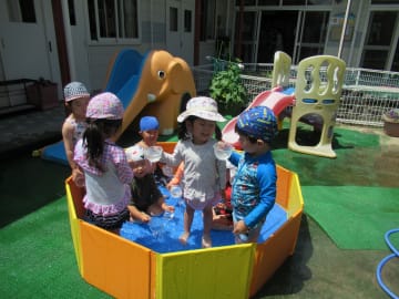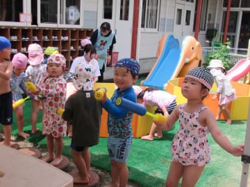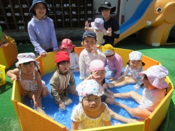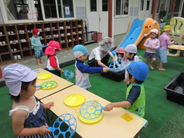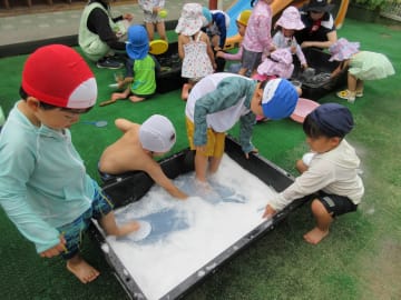 水遊びの期間中、年少組では小型プールを使用した水遊びや色水遊び、泡遊び、水鉄砲、シャボン玉等色々な水遊びを体験しました。色々な素材の感触を味わったり、不思議さを感じたりと友だちと一緒に楽しい経験ができました。