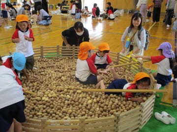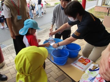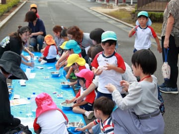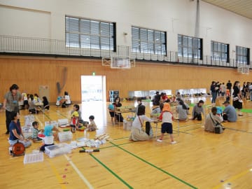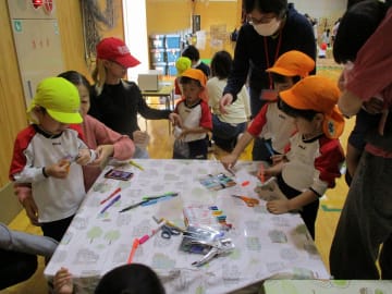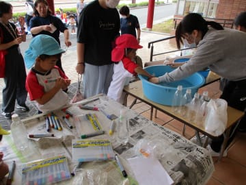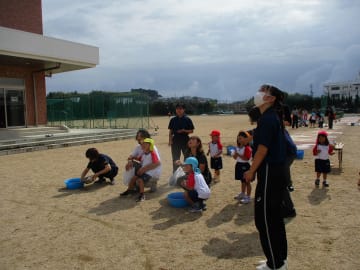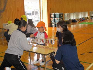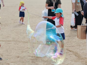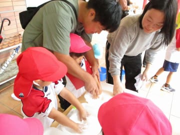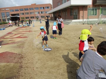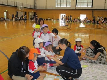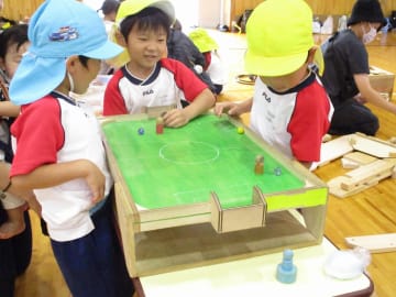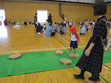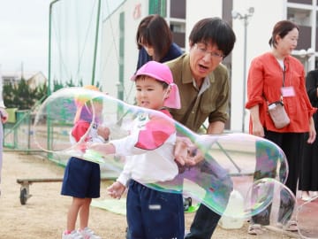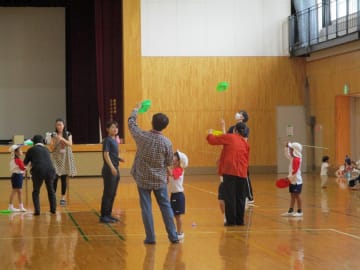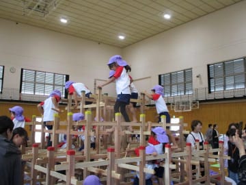 10月16日(水曜日)美作大学体育館とグラウンドで木育参観日を行いました。にいみ木のおもちゃの会の藤本先生や美作大学短期大学部中田教授そして幼児教育学科1年生の学生達と一緒に、たくさんの遊びに保護者の方と参加した子ども達でした。年長組はまず幼稚園のくむんだー(木のジャングルジム)を組立~遊び~解体それから各コーナーへ。年中・年少組はプリプリスライム・どでかシャボン玉・言うことを聞く金魚・鉛筆のくし刺し・ダイラタンシー・バブロケット・クミノ・玉転がし・空気砲とプロペラ・くるくるシャボン玉・プラ版・皿回し・サッカーゲーム等、身近な科学体験や木のおもちゃを通して「わくわく体験」「どきどき体験」をしました。みんなで「やったぁ!楽しかった!」という思いが体験できた参観日でした。