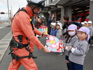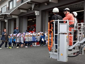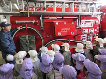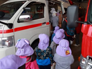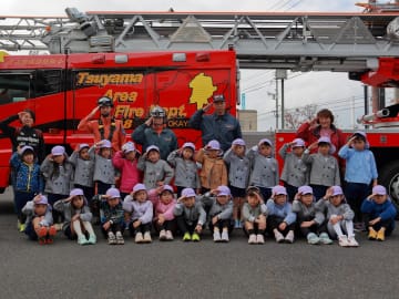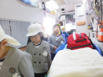 11月27日(水曜日)年長組が消防署見学に行きました。初めていく人が多く、この日を楽しみにしていた様子の子ども達。消防署が近づき消防車や救急車が見えると大喜びでした。消防車や救急車の見学に加え、地震体験や火災時の煙体験をさせていただきました。最後にははしご車も見せていただき、終始大興奮の子ども達でした。勤労感謝の日は過ぎましたが、周りで働く方々に感謝する気持ちを持つことができたように思います。