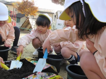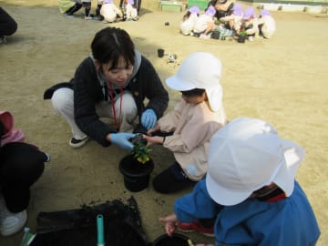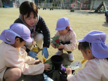 年長組が卒園に向けて式場に飾るパンジーを植えました。保護者クラブの一つである「コスモスクラブ」の方にお願いし、一緒に植え付けができました。鉢にそっと優しく植える姿があり、卒園まで大切に育てていきたいと思います。コスモスクラブさんありがとうございました。